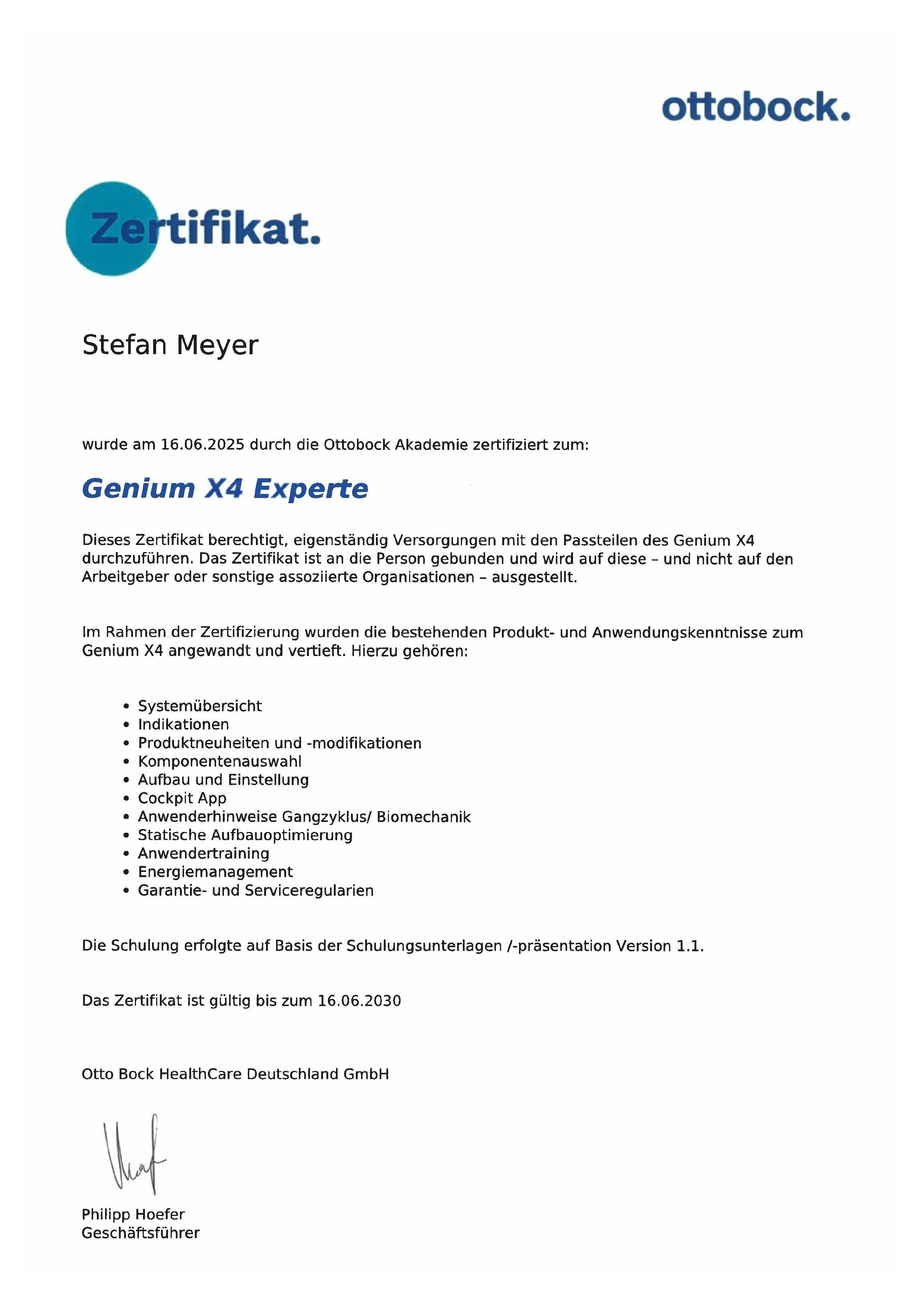Das ist nur ein kleiner Auszug unserer Qualifikationen. Wir besuchen laufend Fortbildungen und lassen uns immer wieder rezertifizieren, damit wir up to date sind und die neuesten Methoden, Geräte und Arbeitsweisen bei uns im Orthopädischen Atelier integrieren können.